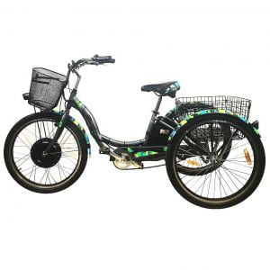 E-trike Stels Electro – трёхколёсный электровелосипед Stels, снабжённый электродвигателем мощностью 350W или 1000W. Скорость такой байк развивает до 35 км/ч. Чтобы привести его в движение можно воспользоваться обычными педалями или нажать ручку газа – например, если необходимо подниматься в гору. Трицикл снабжён двумя корзинами. Передняя имеет размеры 34*25*23 см, задняя 56*38*30. Длина трицикла в собранном виде 180 см, ширина - 70 см по задним колёсам. Вес – 40 кг.